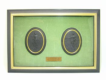 古代ローマ(紀元前27年~紀元14年頃)作のカメオガラス。1582年 古代ローマ皇帝の墓所で 発掘。めぐりめぐって英国国宝となった この壷を 5年の歳月をかけ1790年 ジャスパーウェアで ジョサイアが 完全復刻に成功。彼の名声は 弥が上にもまし 彼の誇りの象徴となつた ポートランドの壷が 末永く ブランドロゴに採用されております。現在は 初代ショサイアの名を汚さない 手工芸銘品にのみ 許されております。