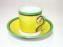 この時代 金彩を使わない 高級品(ドッチア窯の金ロゴ)は珍しいのですが この場合 手描きグリーンの太いポーダーと 手描き臙脂の太いラインは 黄色を 鮮烈に 引き立て 金を使わなくても 高級品としての 自信のある作者の意図が 十分窺えます。古い黄色は 年月を重ねると色褪せるのですが アンティック業者は 褪せたというと 値打ちが下がるので 月日に練れたと 古さを強調して 糊塗せねばならない黄色ですが どうですか この黄色は! 四半世紀を経て まだ この強烈な発色は!